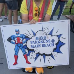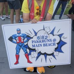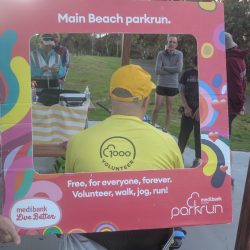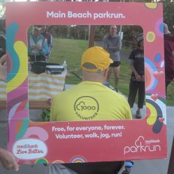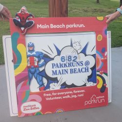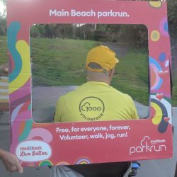 Rory’s yellow v1000 tee was getting more than it’s usual amount of attention and the back of his head (the better side) was photographed many times. The greater attention was probably a result of Main Beach being the original Australian parkrun and it’s participants being a bit more aware of the history of parkrun. This was very evident as Hilarys v500 blue tee also got a lot of attention.