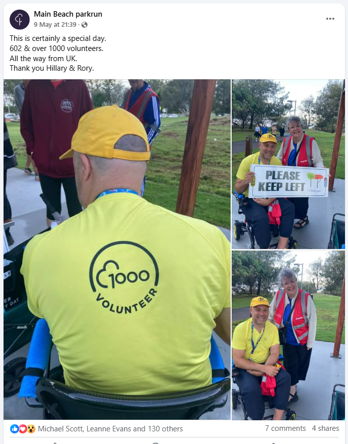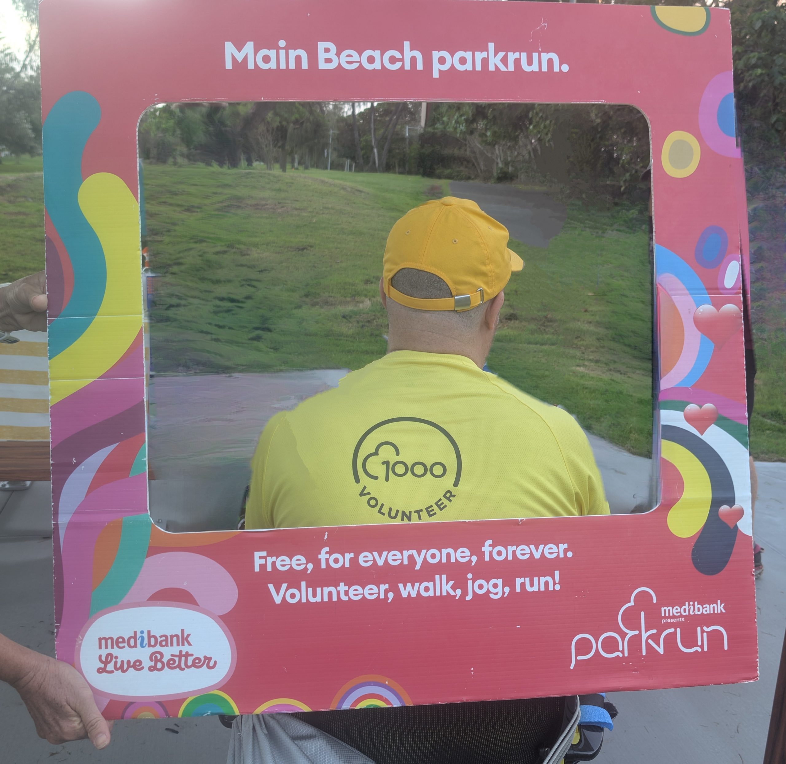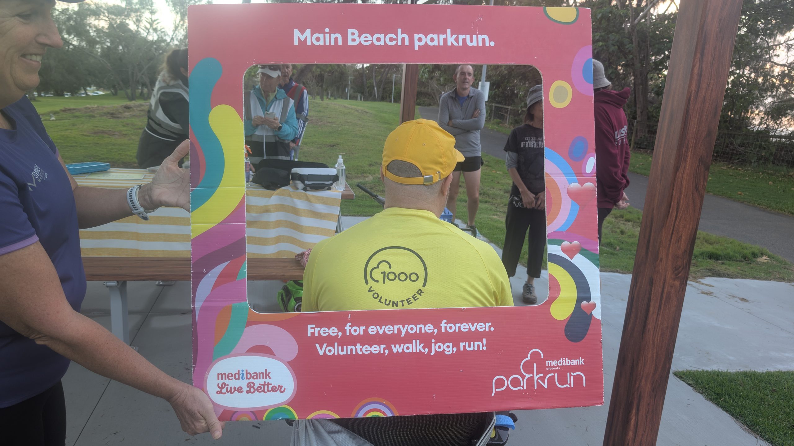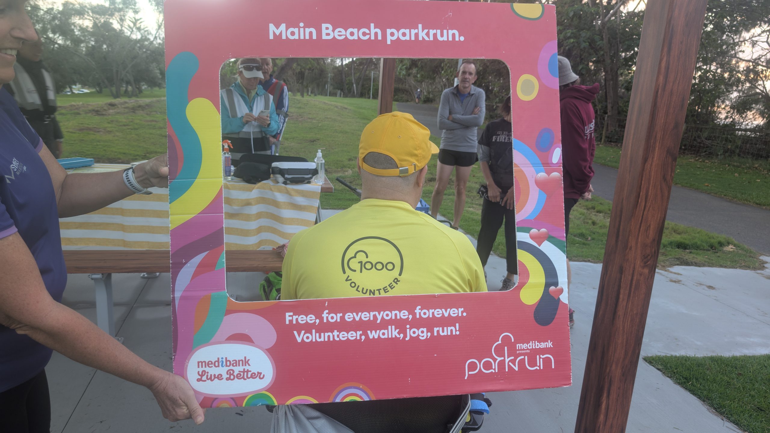 Rory’s yellow v1000 tee was getting more than it’s usual amount of attention and the back of his head (the better side) was photographed many times. The greater attention was probably a result of Main Beach being the original Australian parkrun and it’s participants being a bit more aware of the history of parkrun. This was very evident as Hilarys v500 blue tee also got a lot of attention.