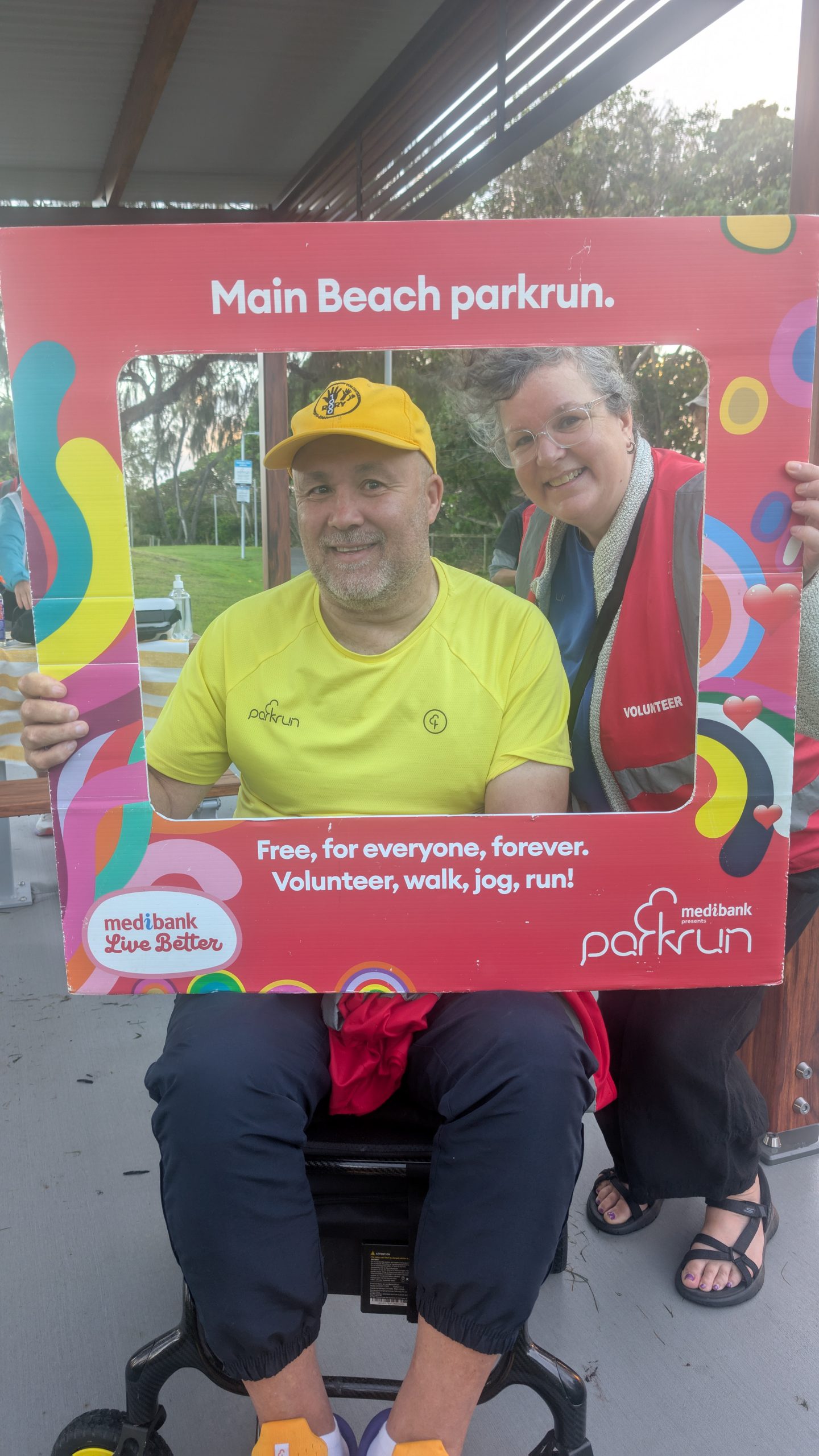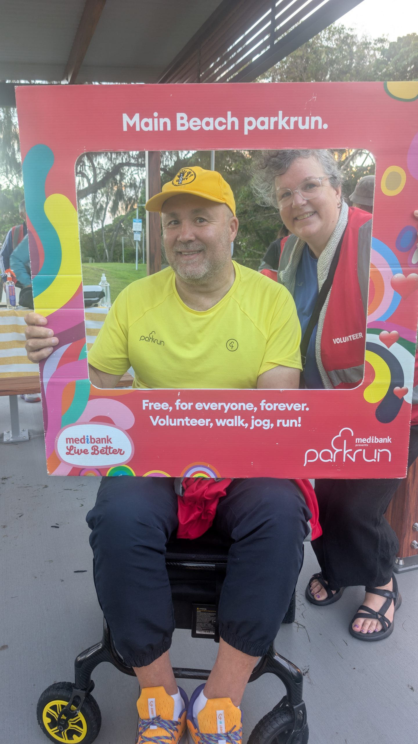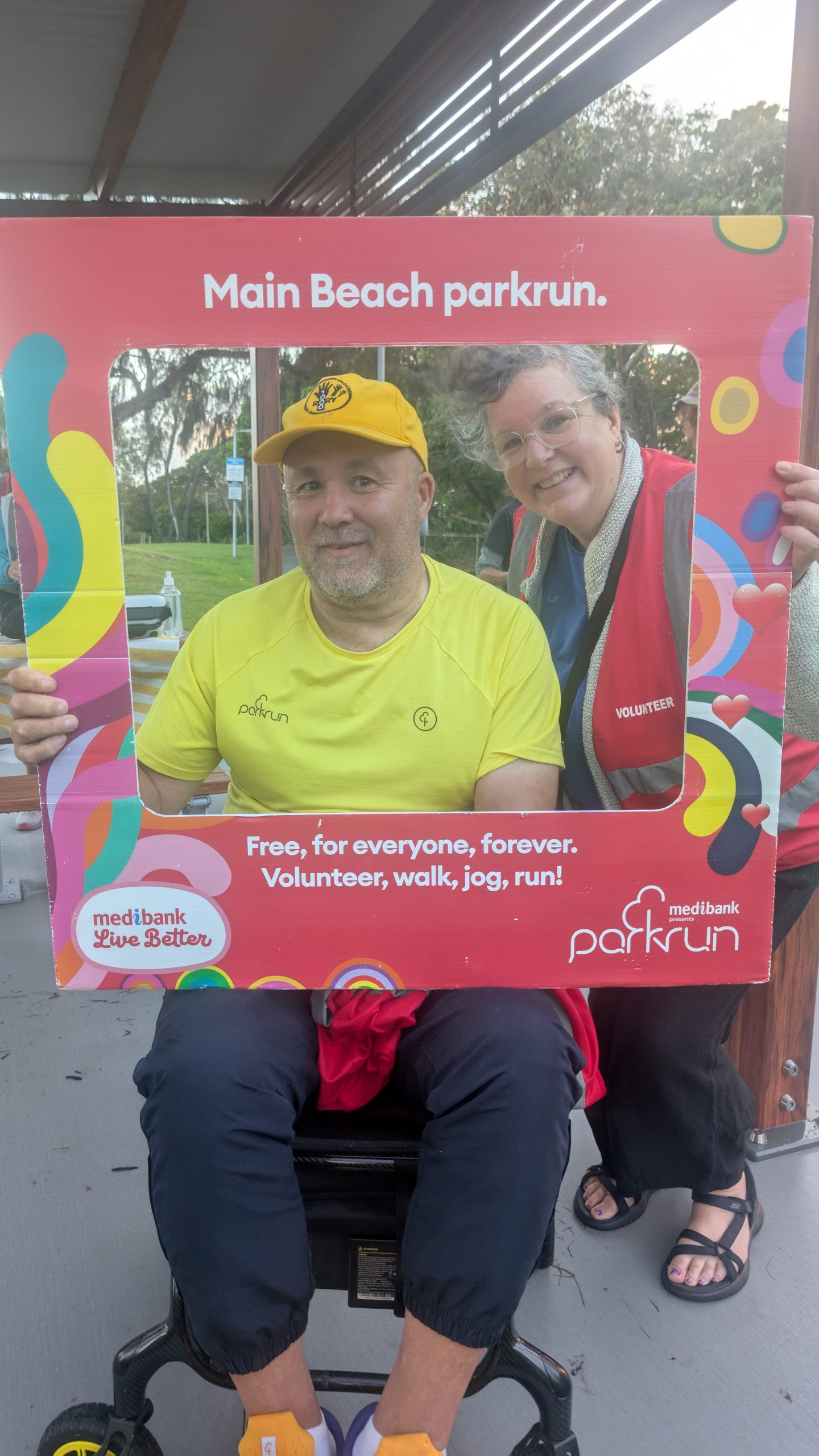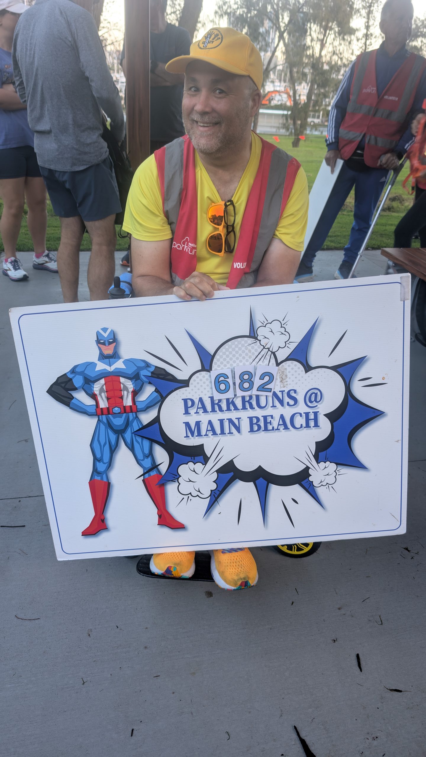 Rory’s yellow v1000 tee was getting more than it’s usual amount of attention and the back of his head (the better side) was photographed many times. The greater attention was probably a result of Main Beach being the original Australian parkrun and it’s participants being a bit more aware of the history of parkrun. This was very evident as Hilarys v500 blue tee also got a lot of attention.