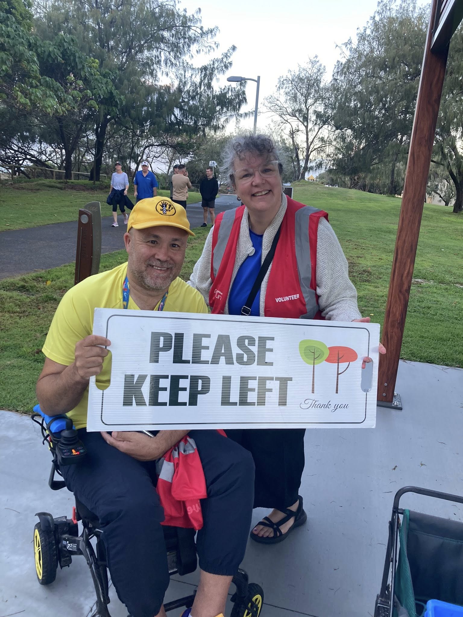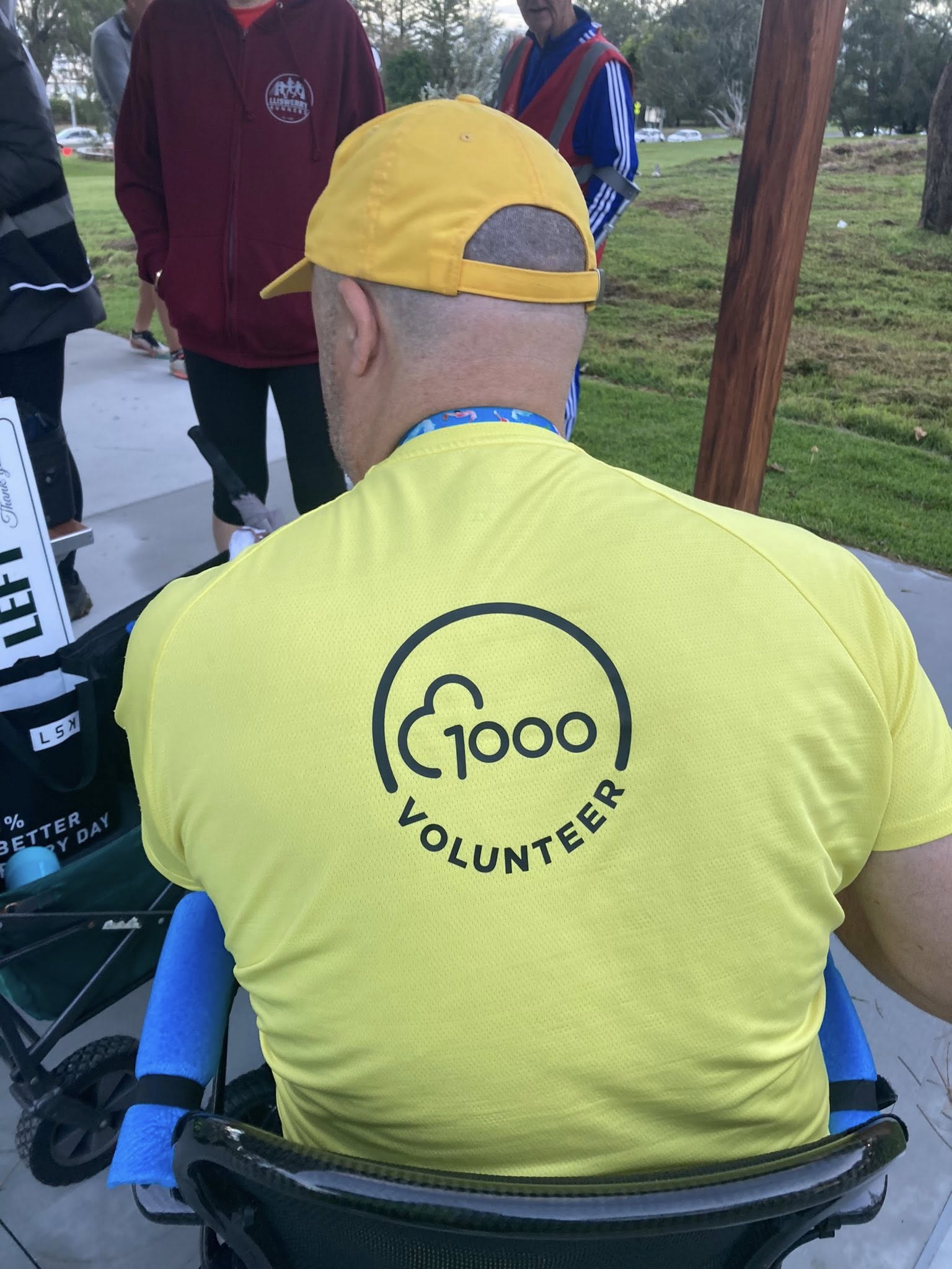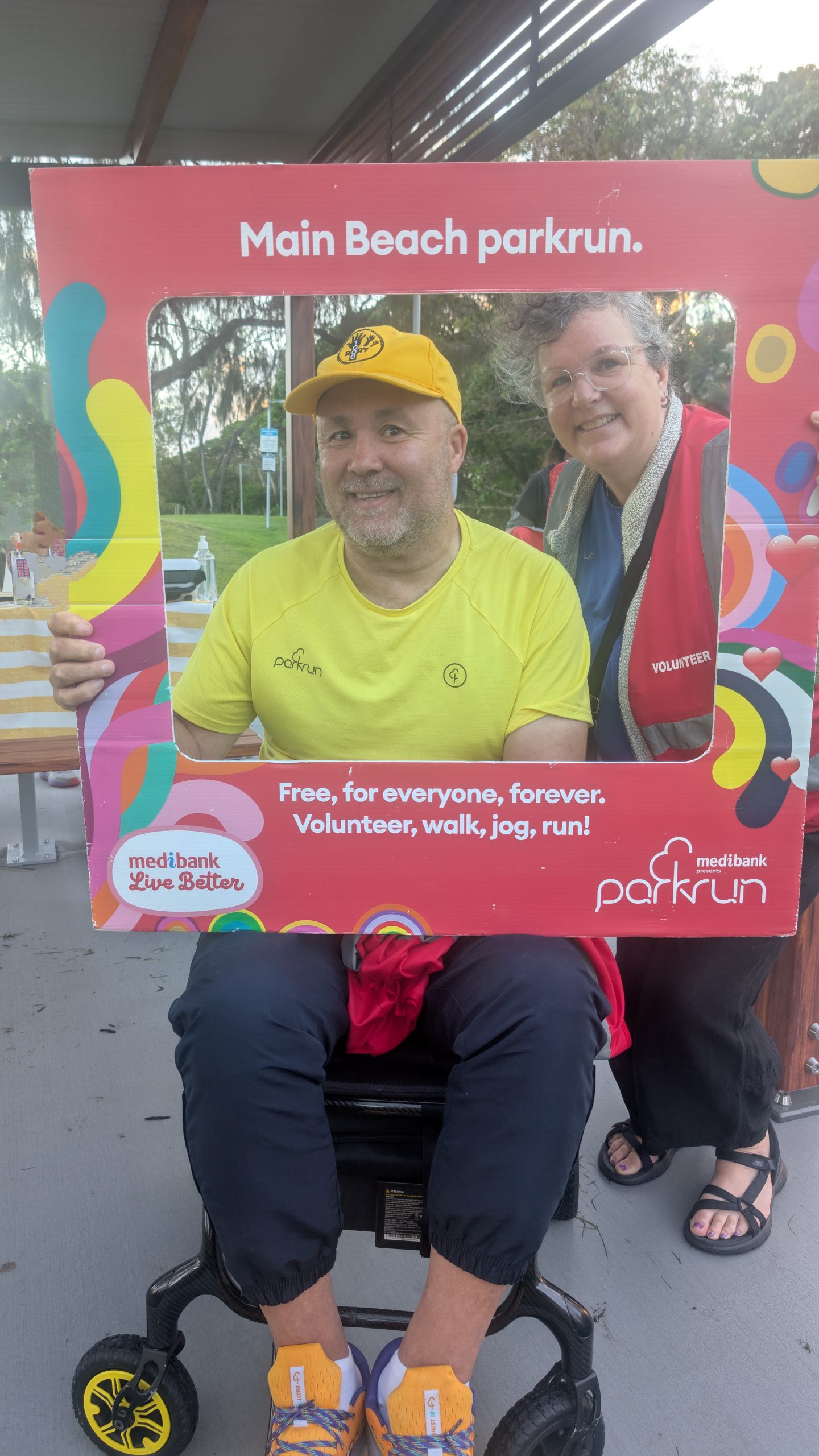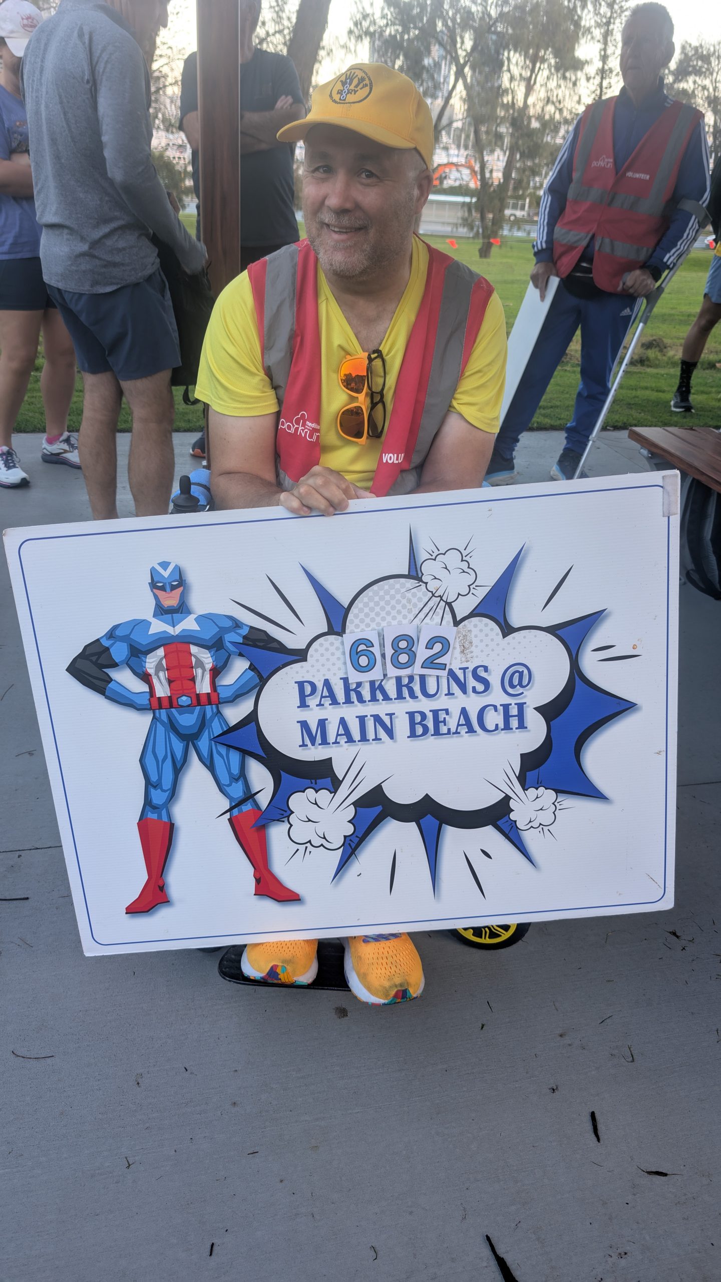 Rory’s yellow v1000 tee was getting more than it’s usual amount of attention and the back of his head (the better side) was photographed many times. The greater attention was probably a result of Main Beach being the original Australian parkrun and it’s participants being a bit more aware of the history of parkrun. This was very evident as Hilarys v500 blue tee also got a lot of attention.